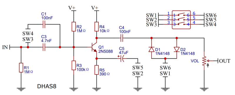 S3 ON: Linear booster. S3 OFF: Treble booster.