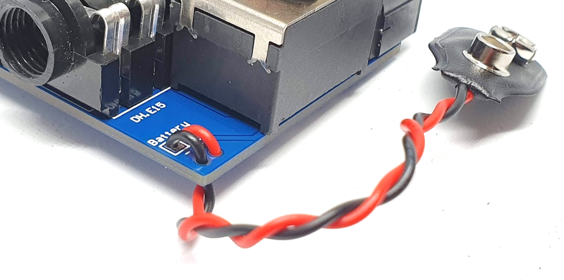 The assembly process is similar to the one for the DH.E14 PCB. Mount the footswitch, jacks, and diode in the enclosure. Adjust the height of the footswitch nut and washer. Use the enclosure itself to get the correct position for all components before you solder. To hold the DC jack, use an unpowered DC connector to keep it centered in the hole, ensuring it doesn't touch the enclosure.