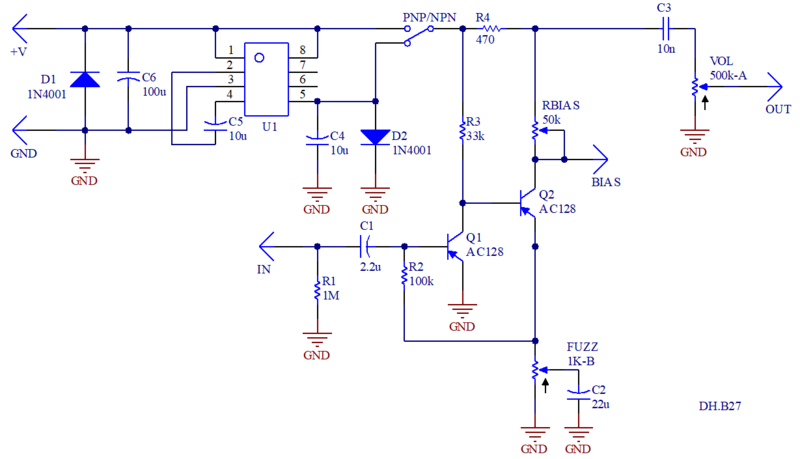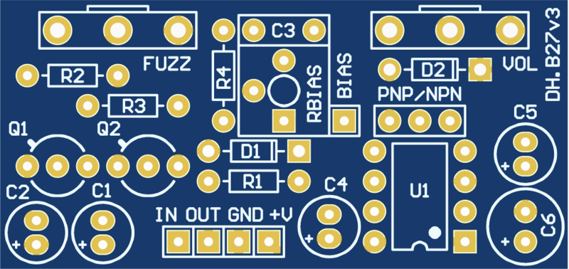 This is the Fuzz Face, the legendary fuzz distortion pedal. The PCB includes a built-in voltage inverter, allowing it to run on negative ground and be daisy-chained with your other pedals from the same power supply.Steps
