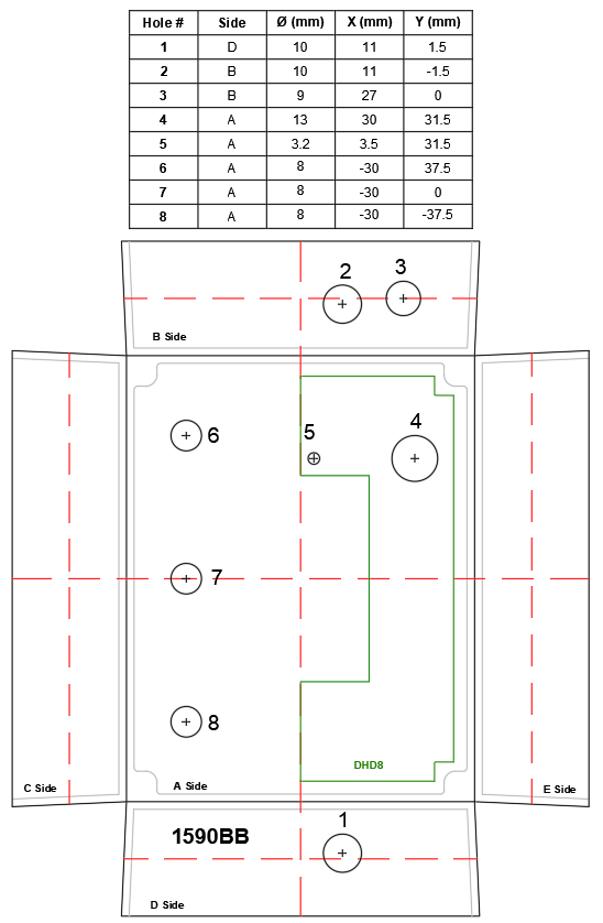 Choose an enclosure and use the custom drilling service. For personalized artwork, use the UV printing service. Add the coordinates from the following table into the online tool at drill.taydakits.com. The holes #1 to #5 are for the 1590B enclosure PCB.