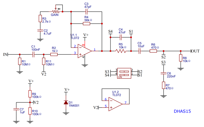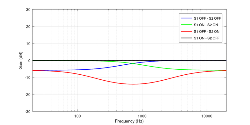 S1 OFF, S2 ON: Band filter with 6dB mids attenuation and 6dB overall gain attenuation.
