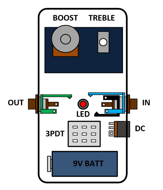 Mount the assembled PCB and the rest of the components (DC jack, input/output jacks, 9V battery clip, 3PDT foot switch, led...) in a metal enclosure. Connect the ground of the circuit to the enclosure (the ground of the jacks are in contact with the enclosure). The following figure shows the components mounted in a 1590B enclosure.