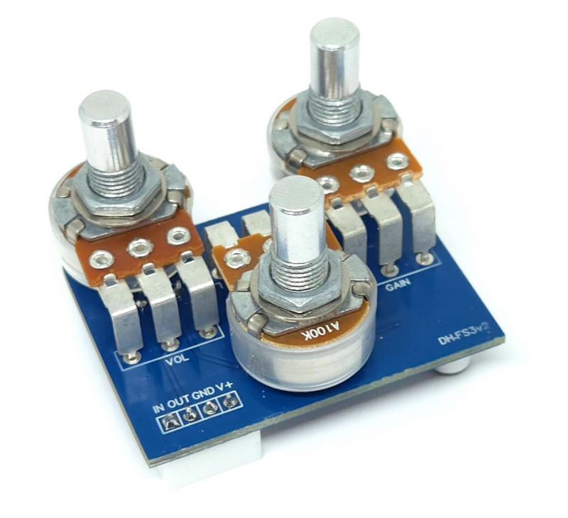 This assembled PCB is based on the RAT circuit with footprints for four DIP switches to customize clipping and bass. Simply install the potentiometers and DIP switches to complete the build.
