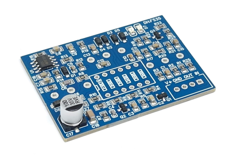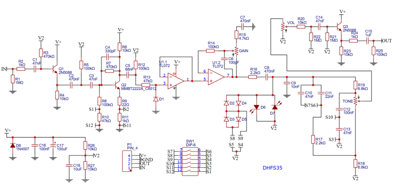 This assembled PCB is based on the classic DS-1 circuit and features six switches for customizing gain, clipping, and tone.Steps
