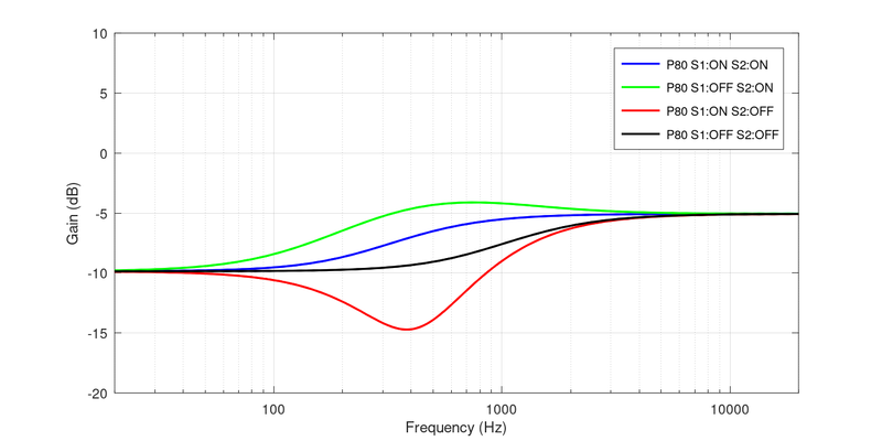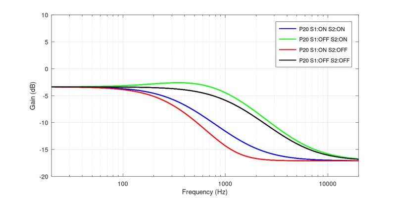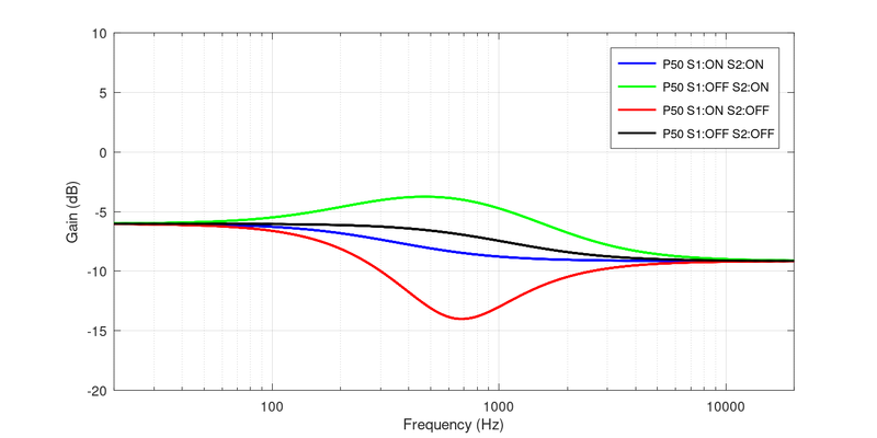 S3 OFF, S6 OFF: Pot at 50%: flatter tone. Pot at max: more bass. Pot at min: more treble.